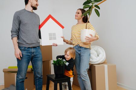 Family moved into a new home. Parents holding symbolic paper toy house and potted plant, looking at each other happily. Child watering potted plant. They surrounded by multiple sealed cardboard boxes.