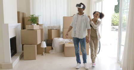 Young couple with big boxes moving into a new house, new apartment for couple, young man and woman helping to lift boxes and organize things for the new home, Moving house.