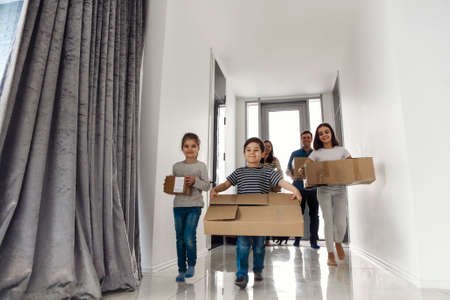 Happy family running in hall. Funny kids jumping with cardboard box, parents laughing, play with children have fun together move at new house. Mortgage loan and relocation concept