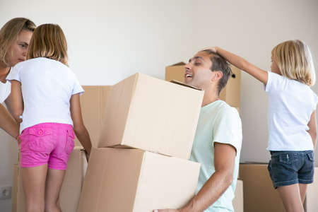 Middle-aged dad holding two carton boxes and sitting with closed eyes. Little girl touching father head. Mother talking with daughter. Family relocating. Mortgage, relocation and moving day concept