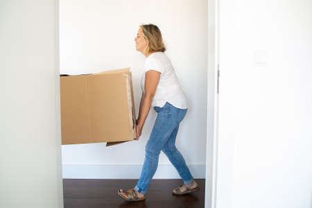 Woman moving into apartment, carrying cartoon box. Side view from doorway. Relocation concept