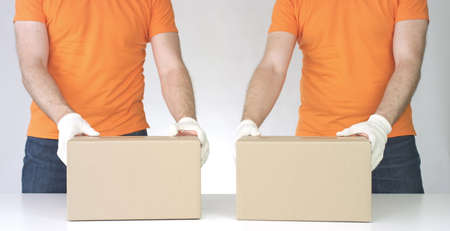 Man in working uniform with boxes in hands delivery loading lifestyle