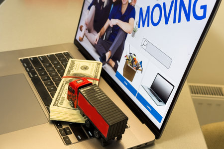 Busy male mover in yellow t shirt looking aside, holding laptop, standing near a stack of cardboard boxes while doing home relocation