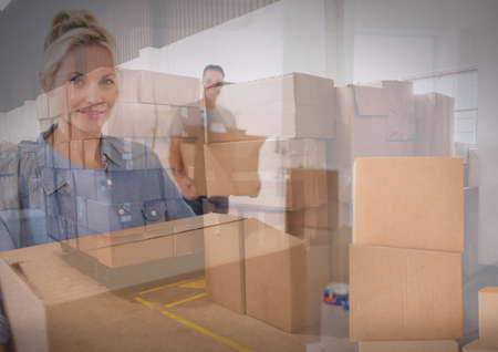 Composition of couple carrying cardboard boxes over stack boxes in warehouse. moving house, global shipment and delivery concept digitally generated image.