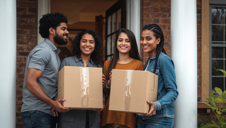 Four people stand outside a house holding boxes. They smile and enjoy their time together while sharing the moment in the afternoon sun. The house has a welcoming entrance.