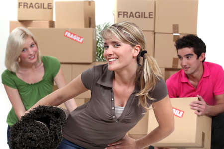 Young woman moving into a new home and is moving, taping and unpacking boxes. Soft backgorund.