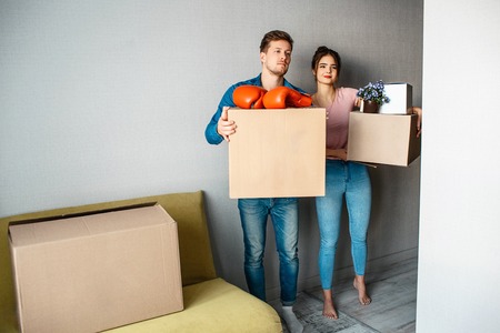 Young family couple bought or rented their first small apartment. They stand in room and hold boxes with stuff. Boxing gloves and flowers on top. Serious.