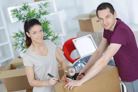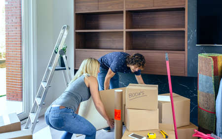 An attractive young couple is in the process of packing for a move. Horizontal shot.