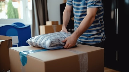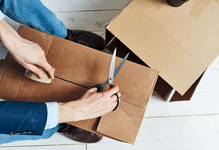 House moving concept. Closeup of man packing cardboard box, moving to a new house