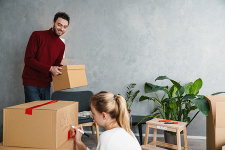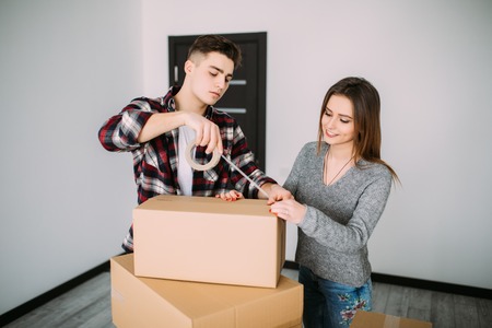 Horizontal long shot of young man and woman getting ready to move to new apartment packing things in boxes and wrapping furniture