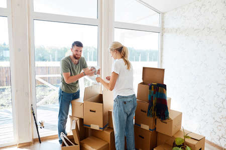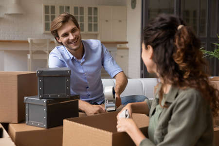 Moving to new home. Overjoyed millennial spouses talk laugh pack things to boxes prepare to relocate to purchased joint property. Friendly family couple move out of rented flat after buying own house