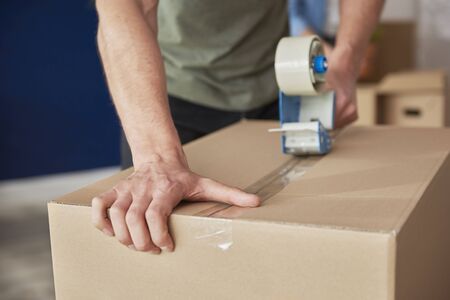 Crop guy using sticky tape to seal carton box while moving into new apartment