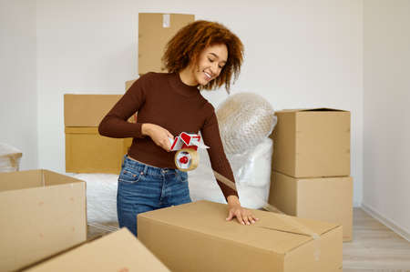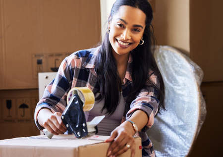 Moving day is finally here. a young woman using tape to pack boxes while moving house.