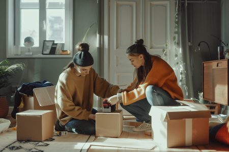Group of friends moving into new apartments or new dorm room with sunlight, carrying boxes and arranging furniture. Moving process enjoyable and efficient.