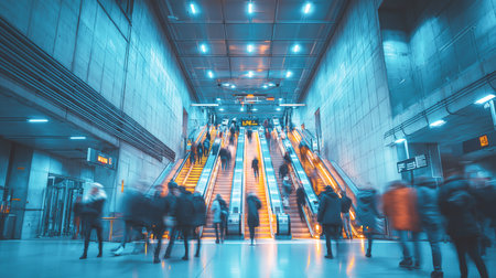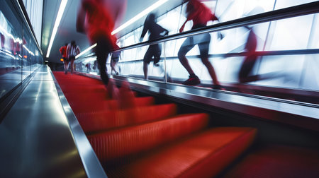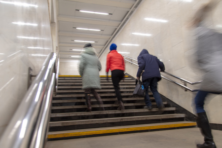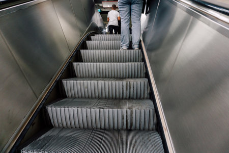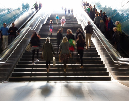 Copenhagen, Denmark - August 12, 2016: People using escalators in the subway of Copenhagen. Blur motion