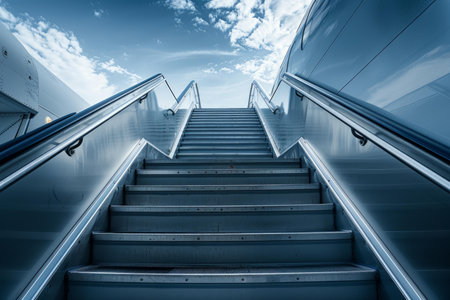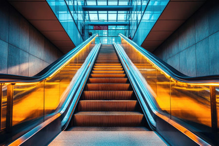 Escalator in airport Tilt-shift lens used to accent the stairs and sublime blue cast applied for more business effect