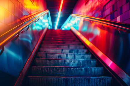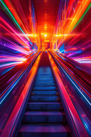 escalator with LED light beside in technology abstract neon colorful light theme.