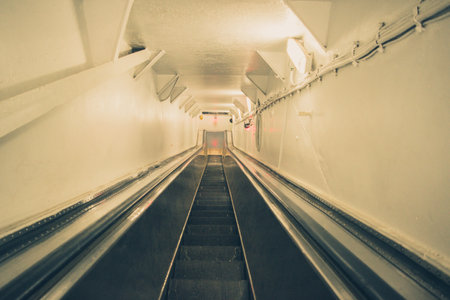 Concept of success in business, moving up the career path. Underground Escalator Conveor in Subway Train Station
