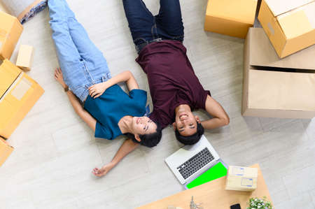 top view of beautiful couple lying on floor and relaxing after packing for new house, moving concept