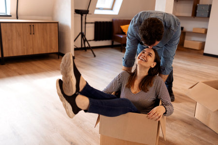 Happy couple is having fun with cardboard boxes in new house at moving day, woman riding sitting in cardboard box while man pushing it.