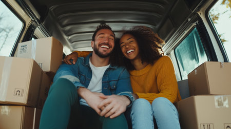 Couple Moving Boxes From Van Or Truck Together Outdoors