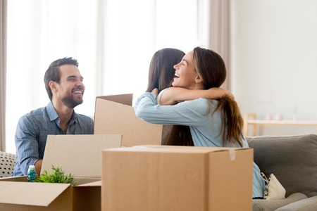 Happy mother embrace small daughter family sitting on sofa in living room with heap of cardboard boxes at new home. Relocation and moving or remodeling, buy or rent new house mortgage and loan concept