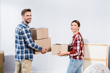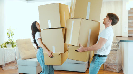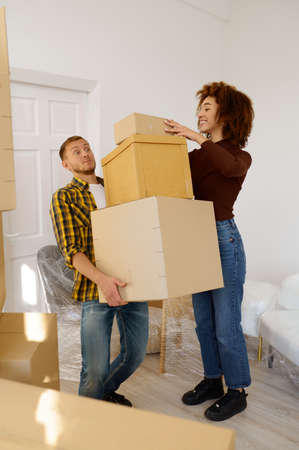 Furnishing new home. Friendly millennial husband wife carrying moving boxes with stuff to purchased own studio apartment. Cheerful spouses hold container with furniture items domestic decor elements