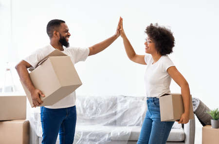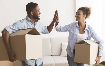 Moving Preparations. African Couple Giving High-Five Holding Packed Boxes Ready To Move In New Home. Real Estate Ownership Concept. Family Celebrating Relocation Together