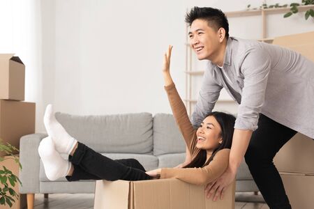 Happy young asian couple smiling relaxing and having fun while playing with cardboard box in new house, celebrating moving to new home concept