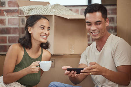 Lets invite our friends and family over to our new home. a man using his cellphone while sitting with his girlfriend in their new home.