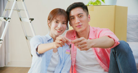 close up happy young asian couple hold keys of new house - they sitting on wooden floor with many boxes are looking at camera
