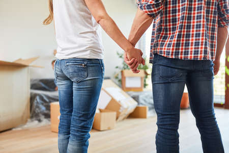 A man and a woman hold hands, against a background of cardboard boxes with things and a white background close-up. The concept of moving to a new home.