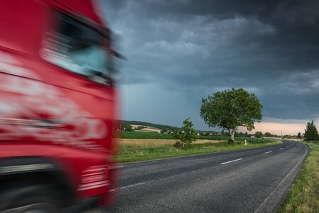 Red truck on asphalt road under stormy sky with clouds