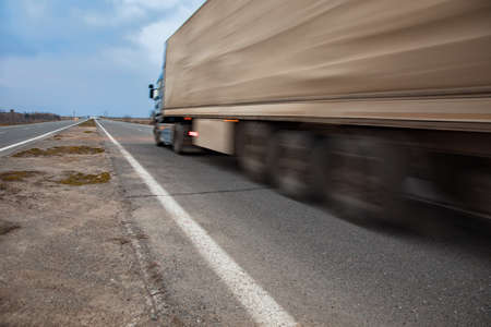 Blurred unrecognizable truck transport on road. Transport overpasses on the highway for the transport of orders and goods