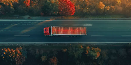 High-angle shot of cargo truck on asphalt road with white dashed lines and shadows