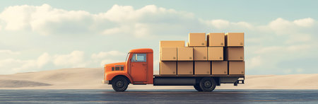 A side view of a 3D brown delivery truck, with boxes leaning against it, placed on a soft ivory-colored background.