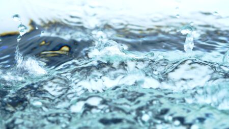 Water splashes with bubbles. Fluid in motion. Selective focus. Close up and horizontal orientation.