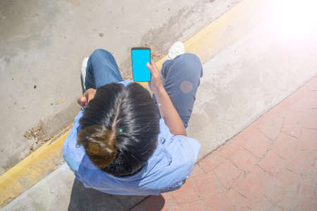 Close up hand holding mockup device of smartphone blank white screen. top view