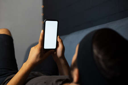Close-up of young man lying on sofa and using smartphone with mockup.
