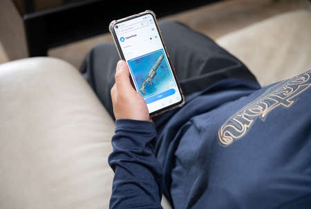 CHIANG MAI, THAILAND - AUG 26, 2020: A woman holds Apple iPhone X with Instagram application on the screen at cafe. Instagram is a photo-sharing app for smartphones.