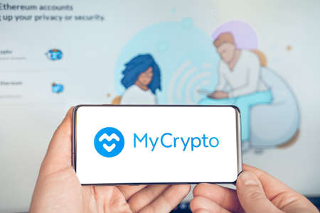 Russia Moscow 19.01.2022 Businessman, mobile phone with logo of MyCrypto cryptocurrency Ethereum Wallet Manager. Blockchain application to buy, store, send, swap crypto coins, digital tokens.