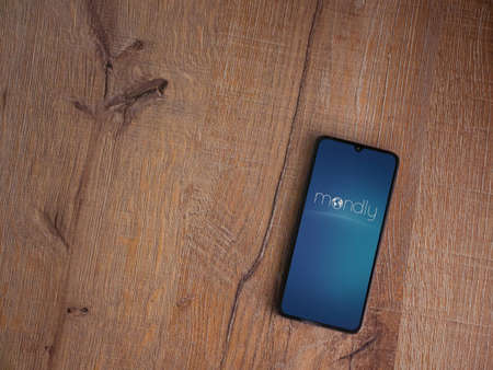 Lod, Israel - July 8, 2020: Mondlay - Language learning app launch screen with logo on the display of a black mobile smartphone on wooden background. Top view flat lay with copy space.