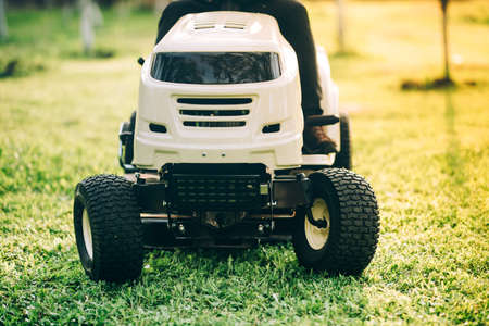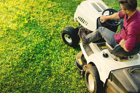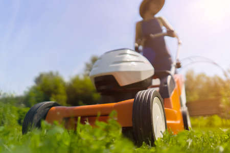 Gardening activity, lawn mower cutting the grass driven lawn mower in sunny garden