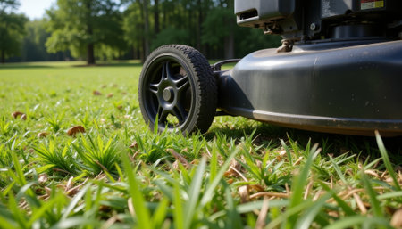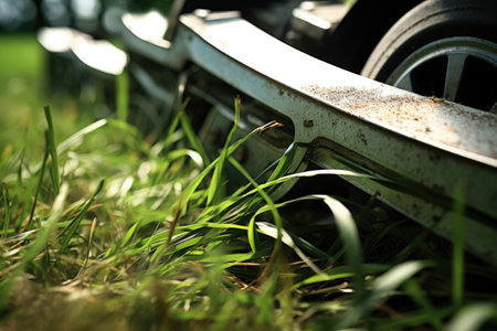 close-up of lawnmower blades grass, created with generative ai