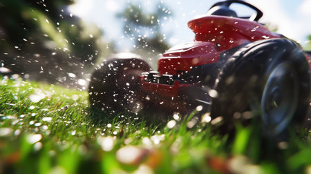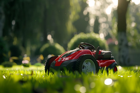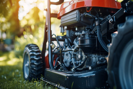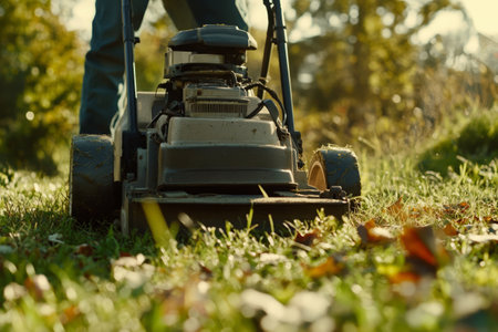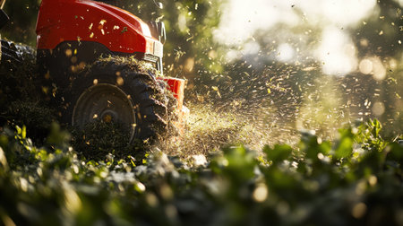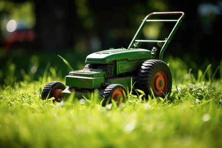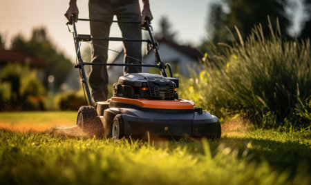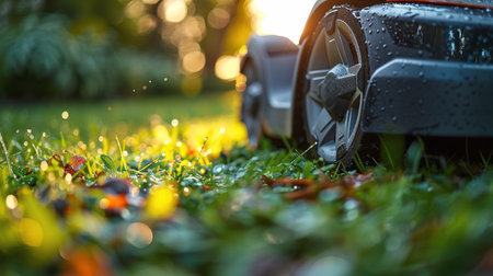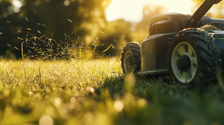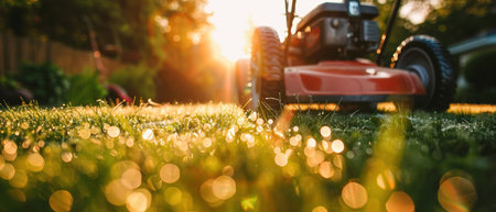 close-up of a lawn mower grass at sunrise, created with generative ai
