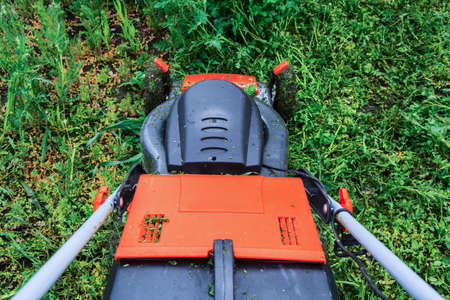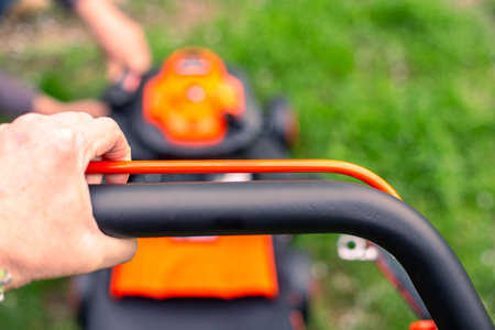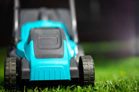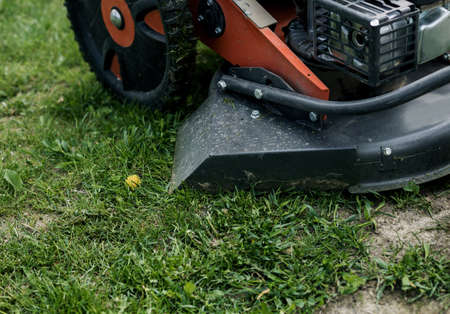Mowing lawns, Lawn mower on green grass, mower grass equipment, mowing gardener care work tool, close up view, sunny day