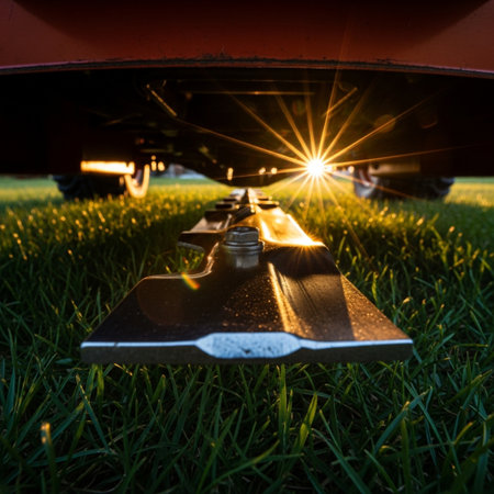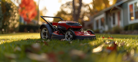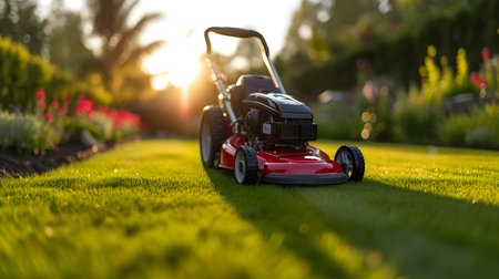 Lawn mower is parked on vibrant green grass during sunset, capturing the warm glow and highlighting the freshness of the landscape with blades shining.