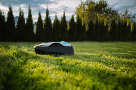 A lawn mover on green grass in modern garden. Machine for cutting lawns.