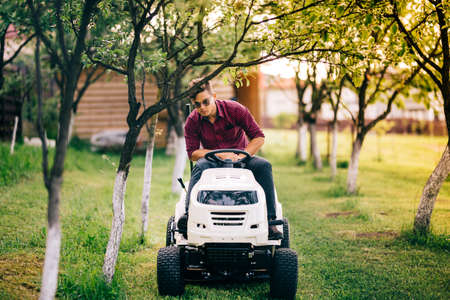 male worker riding lawn mower and trimming grass in garden
