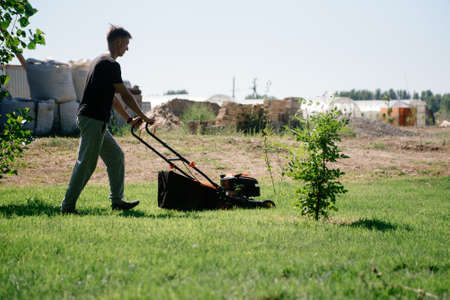 A young male gardener in overalls uses a lawn mower.Man mows the lawn with a lawn mower.Gardening and lawn mowing concept